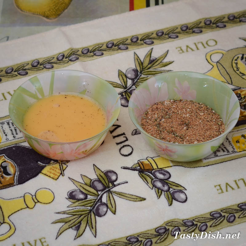 Приготовить панировку. Смешать панировочные сухари, кунжут, майоран и базилик. Яйцо взбить с солью и перцем.